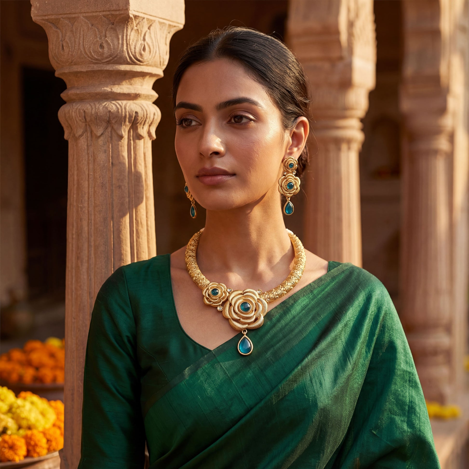 The Epitome of Elegance: Hasadi Necklace | Rajwadi Rose Design with Green Stones Bridal Set