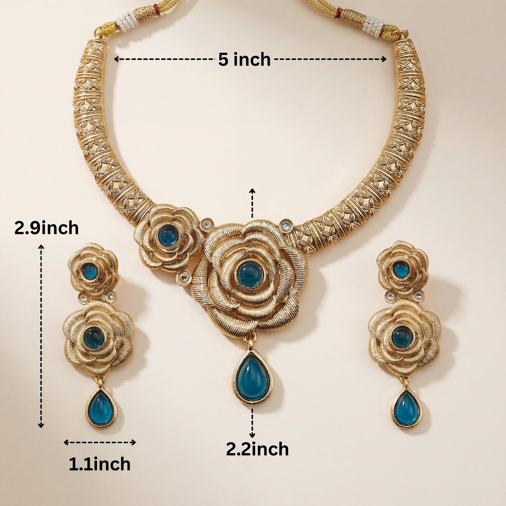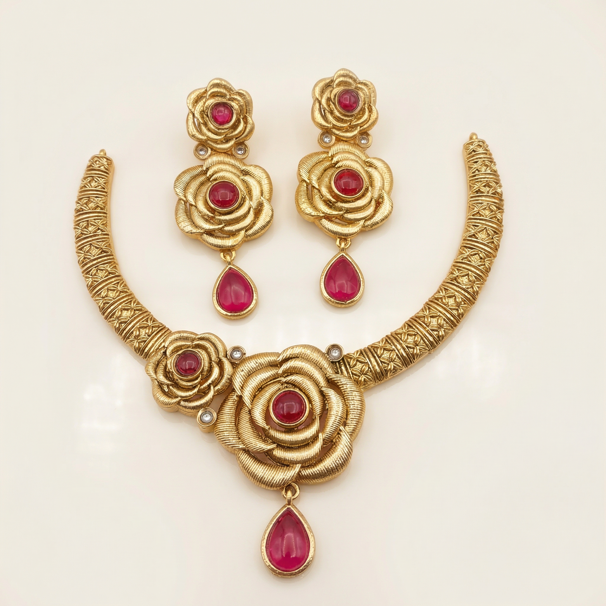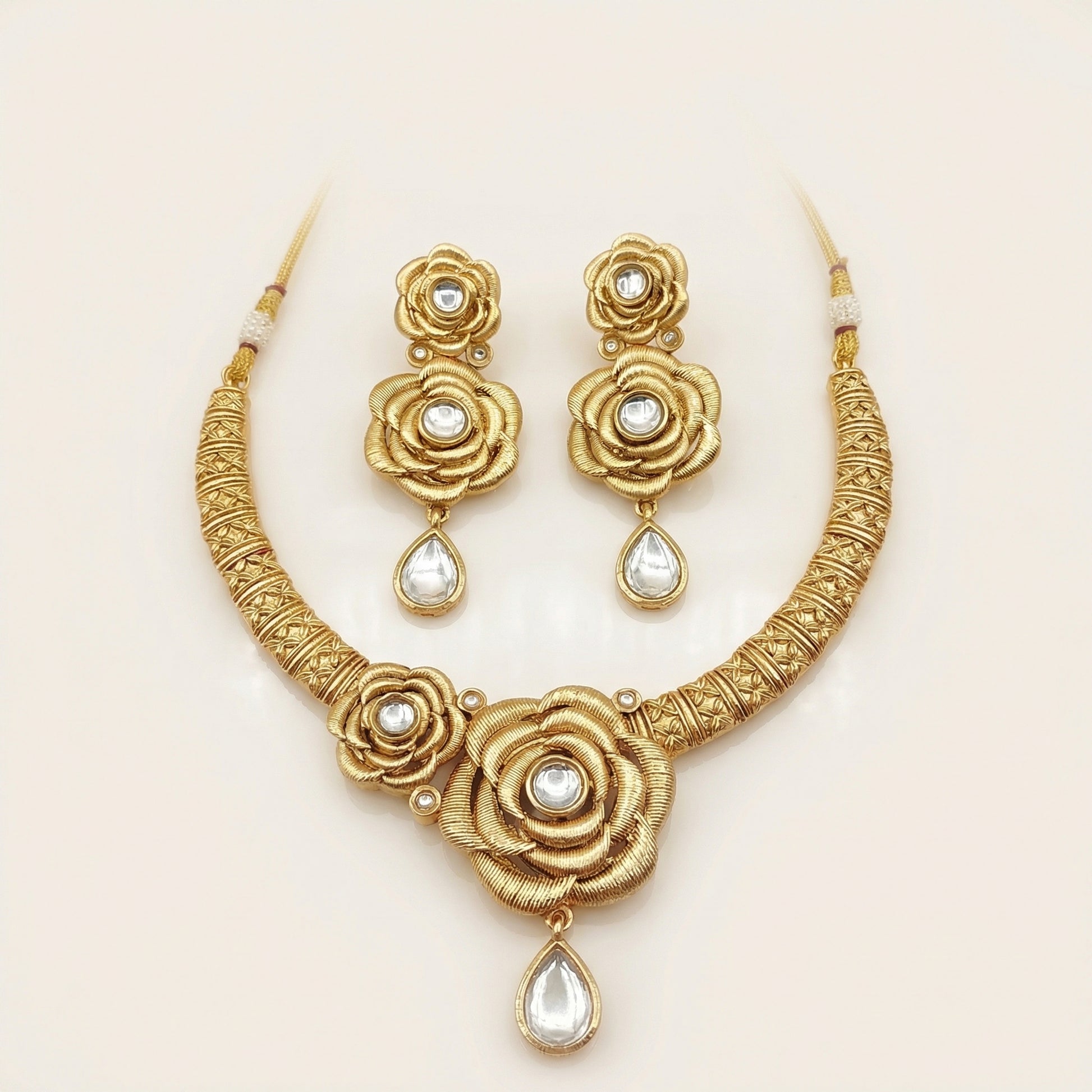 Hasadi Necklace | Rajwadi Rose Design with Green Stones Bridal Set