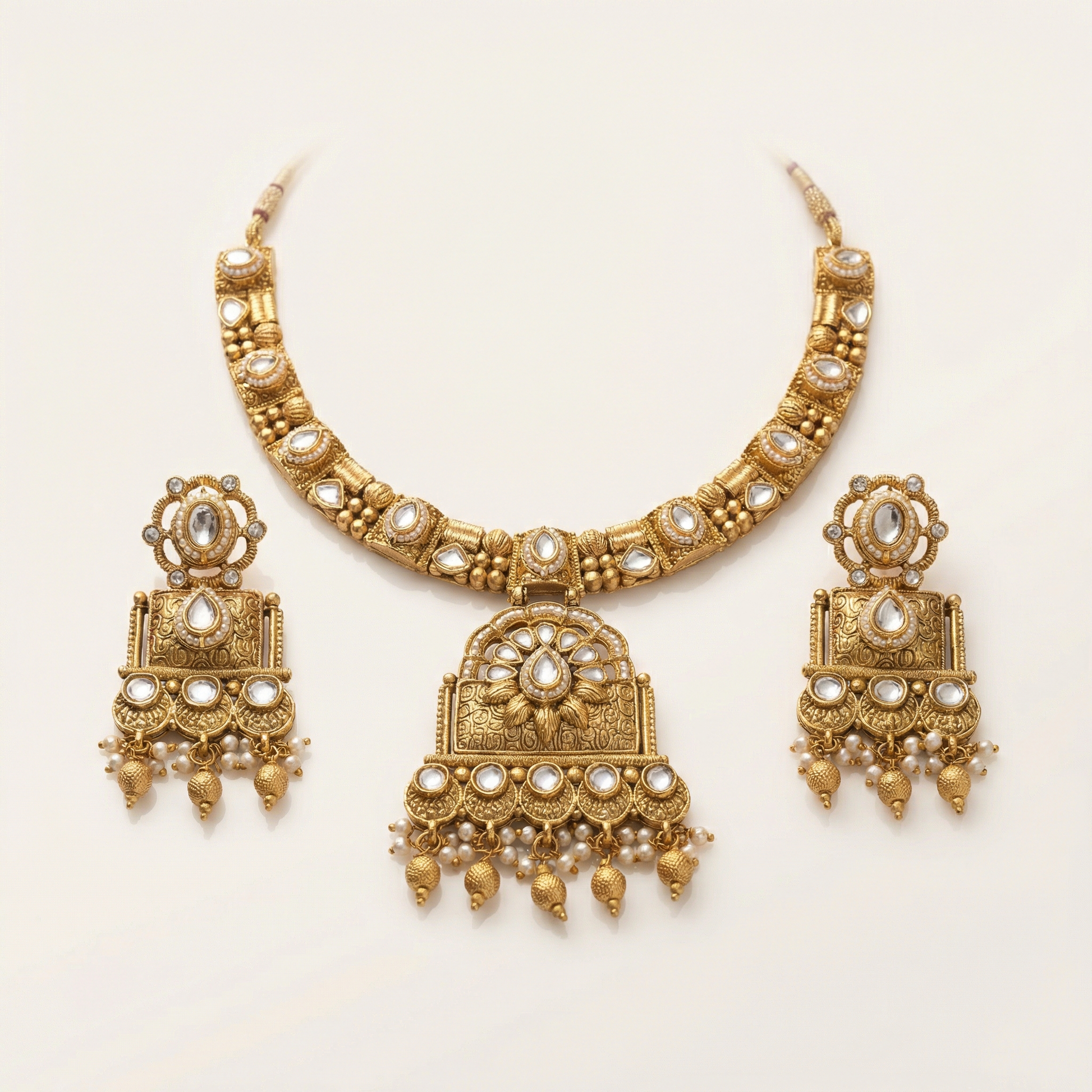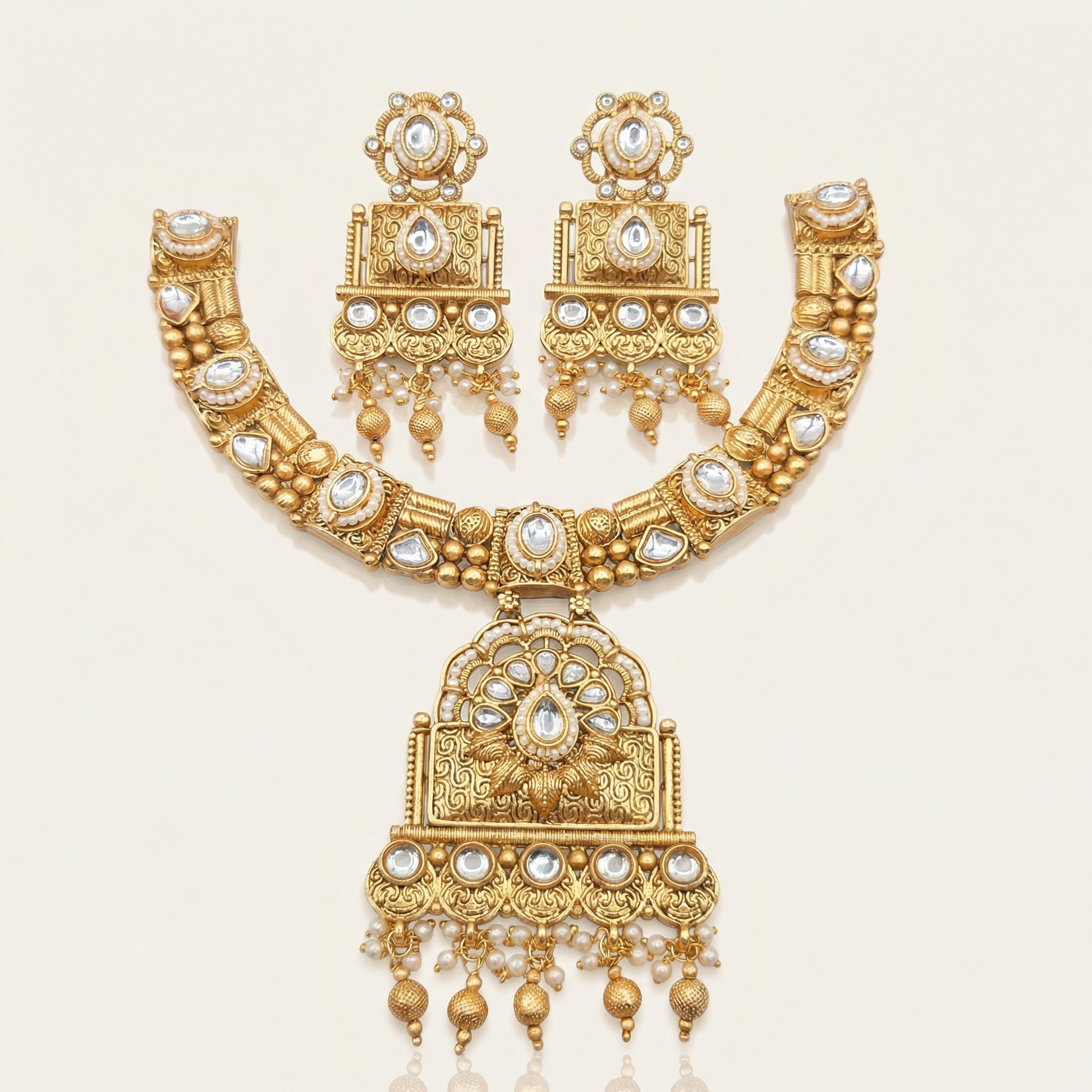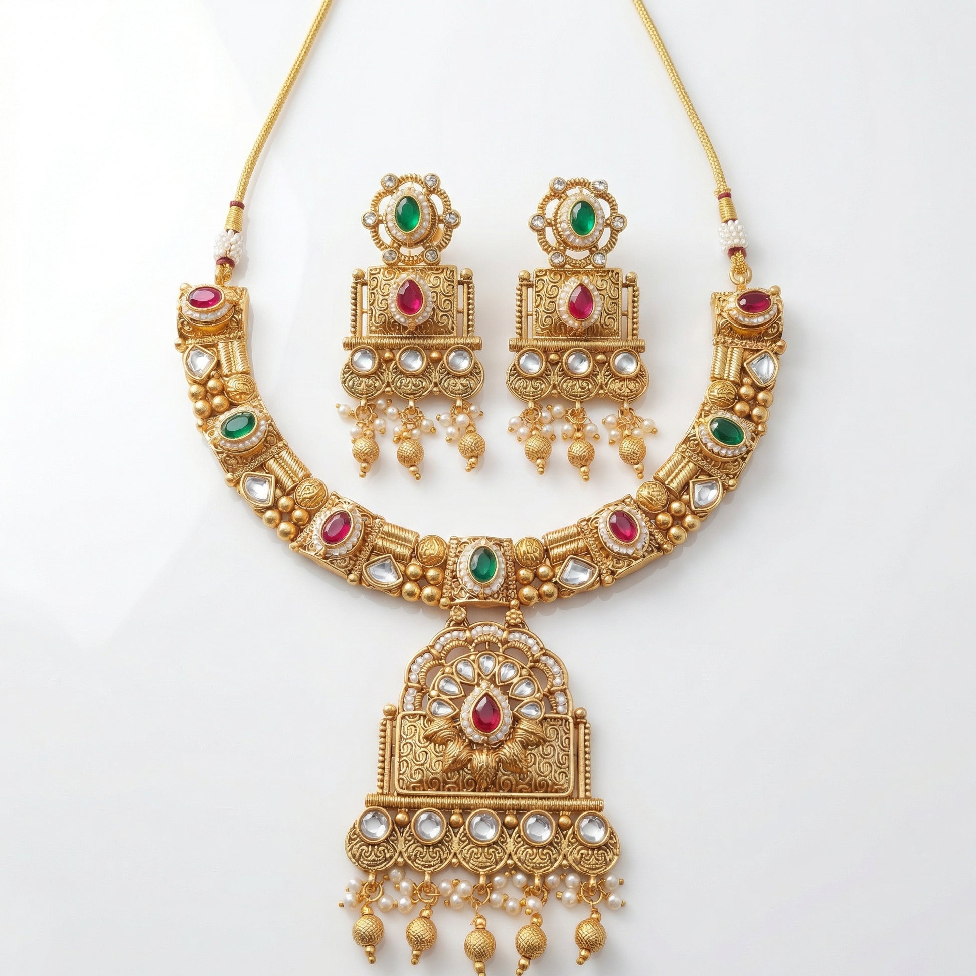 This exquisite Temple Choker Necklace from Pallavi Gold-Plated South Indian Jewellery Set is an ode to the rich heritage of India. Handcrafted with intricate details and adorned with sparkling gold-plating, this piece is a masterclass in understated sophistication.