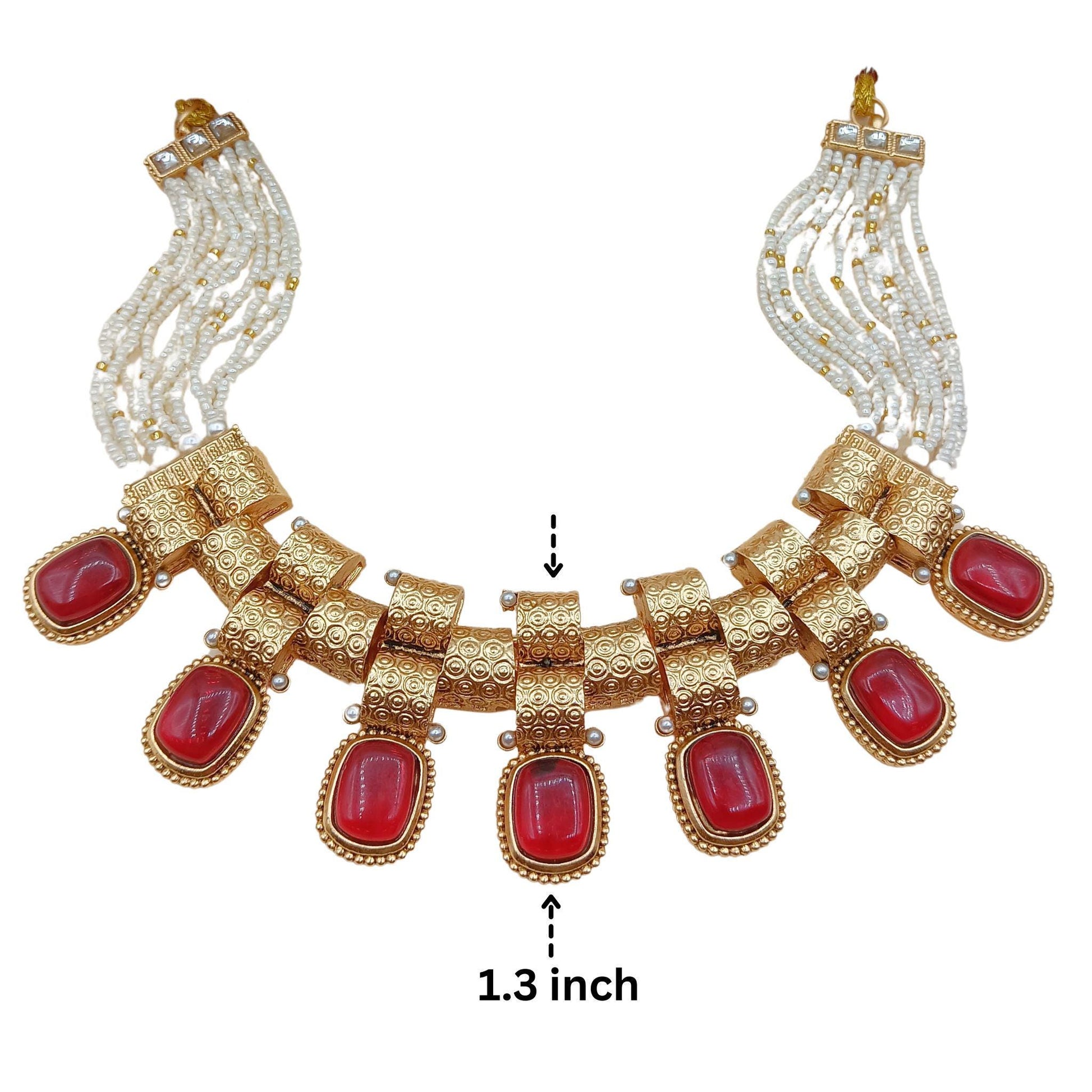 Rajwadi Necklace Set: Gold-Tone Red Stone Choker with Pearl Accents